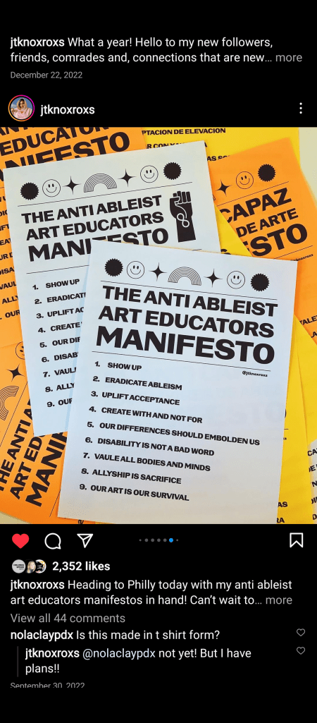 Jennifer White-Johnson is a fascinating project- based educator, advocate, and graphic designer. I cried when I missed her engagement at Moore College of Art in Philly — missed, as many things are for me, because a haze of pain both before and during was my “priority”. (And if I had not had the pain, I’d have made sure the time was used to be with the kids, who are still getting used to seeing me with a mobility aid.)