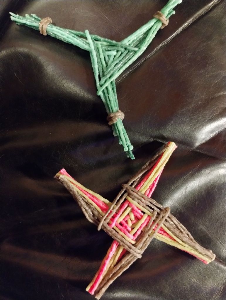 We made a few different types of St. Brigid’s crosses with wax craft sticks.