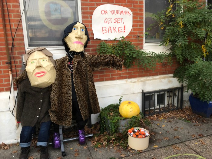 Since they didn’t allow me to have that much fun with their costumes, and we didn’t want to go out dressed up ourselves, I had a concept– which Tucker did the bigger portion of carrying out. That is heroic of him, as he is in the middle of his PhD. I saw that I was heading towards the last of the making of Halloween costumes and being needed by my now-teenaged children for Halloween in general, so damnit, I needed scarecrows. Of Noel Fielding and Sandi Toksvig.