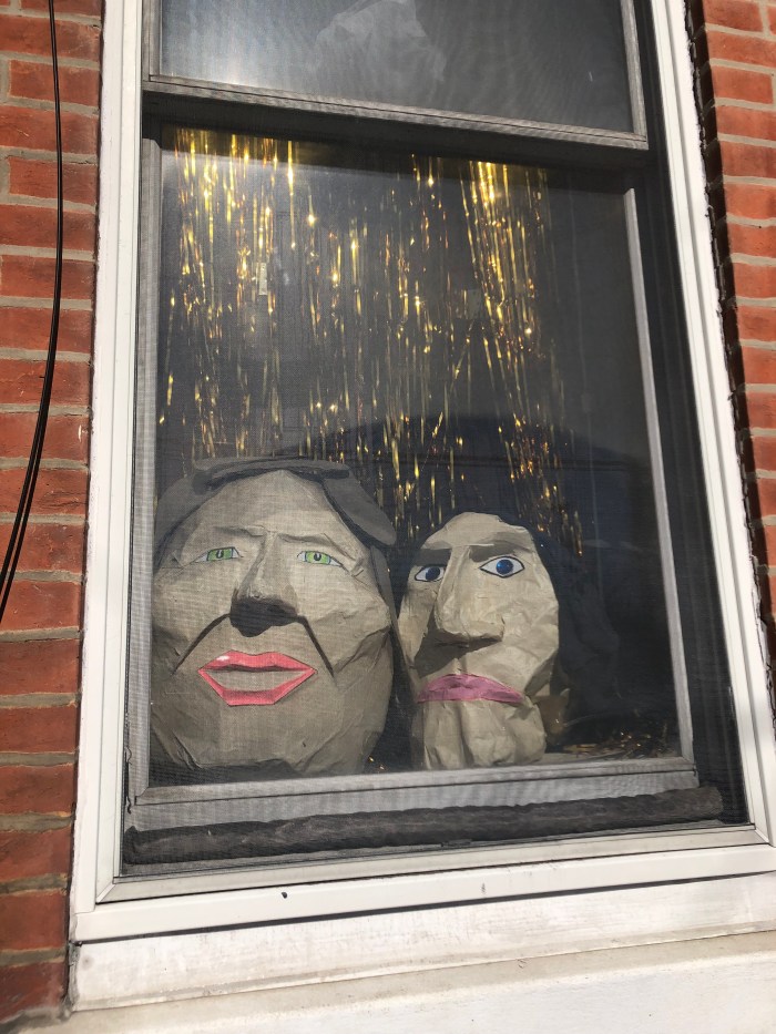 Noel and Sandi had been supported by the base of a portable laptop desk, and when they were brought in their bodies were broken (but not ransacked). Their heads remain in our front window that does not have fig lanterns in it.